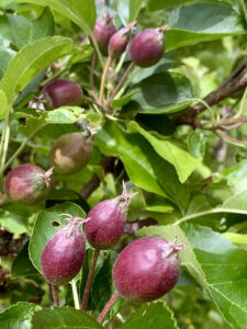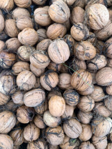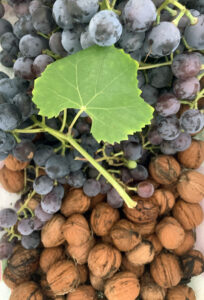 Avec divers arbres fruitiers (cerisiers, vignes, noyers, pommiers, noisetiers, figuiers), des fleurs et des plantes.